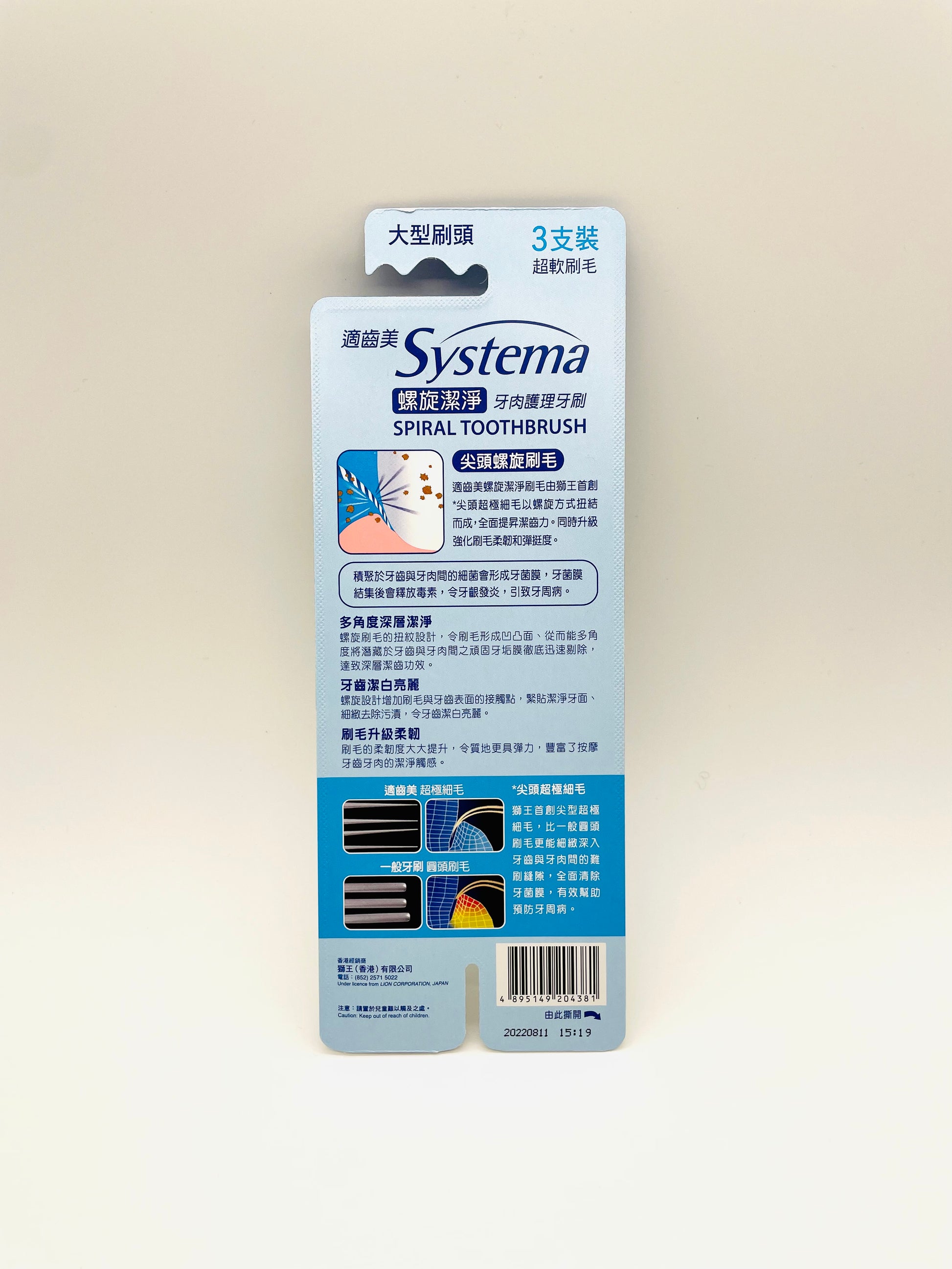 * 多角度深層潔淨:螺旋刷毛的扭紋設計,令刷毛形成凹凸面、從而能多角度將潛藏於牙齒與牙肉間之頑固牙垢膜徹底迅速剔除,達致深層潔齒功效。